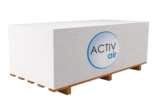 Placă din gips-carton, tip A, muchie PRO (SR EN 520 + A1:2010), miez din ipsos și înveliș din carton gri, greu combustibilă (clasa de reacție la foc A2-s1,d0). Contribuie la îmbunătățirea calității aerului interior: miezul aditivat captează, reține și descompune formaldehida, substanță nocivă din aerul interior.
