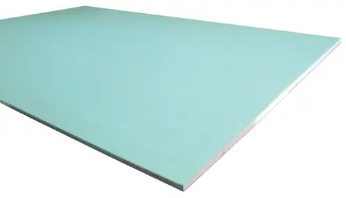 Placă din gips-carton, tip DFH2, grosime 12,5 mm, muchie PRO (SR EN 520 + A1:2010), cu miezul din ipsos special tratat și 2% conținut de fibră de sticlă și înveliș din carton verde, greu combustibilă (clasa de reacție la foc A2-s1,d0), pentru rezistență la foc și umiditate.